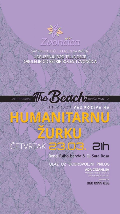 Beograđani su još jednom rešili da pokažu koliko su humani. U četvrtak, 23. marta, na Adi ciganliji (Makiška strana), u cafe restoranu The Beach biće održana žurka, a prihod od prodaje pića namenjen je Udruženju roditelja dece obolele od malignih i drugih retkih bolesti “Zvončica”.