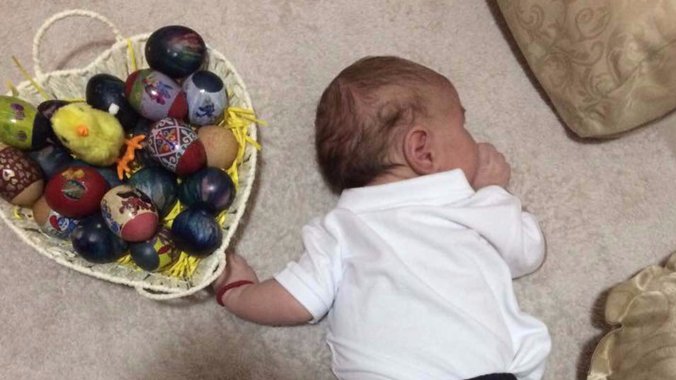 Na jednoj od njih ponosni tata drži svog naslednika koji gleda kako se njegovi roditelji kucaju jajima, dok se na drugoj mališan uspavao pored korpice sa jajima.