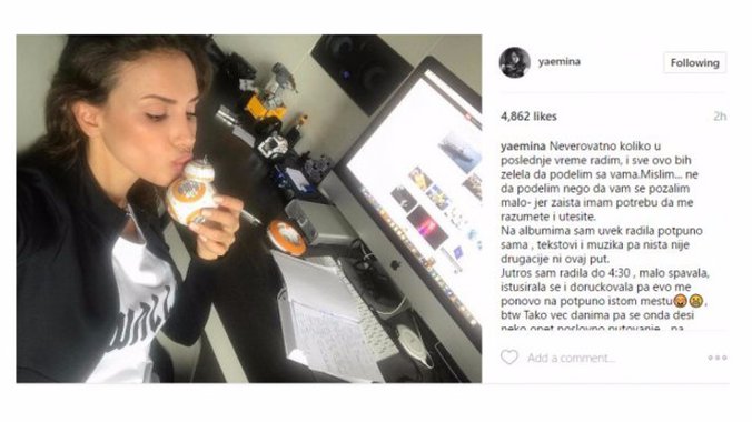 Neverovatno koliko u poslednje vreme radim, i sve ovo bih želela da podelim sa vama. Mislim... Ne da podelim, nego da vam se požalim malo, jer zaista imam potrebu da me razumete i utešite. Na albumima sam uvek radila potpuno sama, tekstovi i muzika pa ništa nije drugačije ni ovaj put. Jutros sam radila do 4:30, malo spavala, istuširala se i doručkovala, pa evo me ponovo na potpuno istom mestu. Tako već danima, pa se onda desi neko opet poslovno putovanje... Pa repeat. Ovaj mališan koga ljubim zove se BB-8. I baš kao u filmu "Cast Away" sa Tom Henksom, ja i BB-8 jedno drugom smo super podrška. Šalu na stranu, album je pri kraju i dala sam sve od sebe da to bude najbolje i najbrže što može... Treba mi snaga koju pronalazim u vašoj ljubavi i podršci - napisala je pevačica na Instagramu.