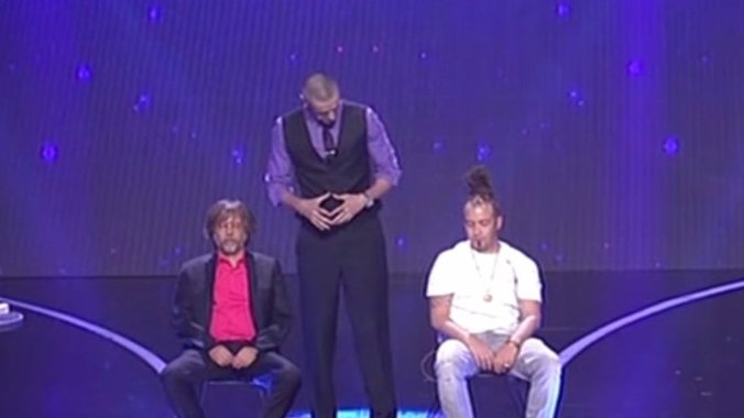 On je izašao na scenu na kojoj je bio postavljen stočić, pa je izveo Rastu i Žiku da sede na stolicama, žmure i odgovaraju na njegova pitanja.