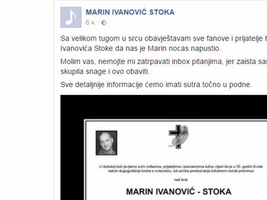 Sa velikom tugom u srcu obaveštavam sve fanove i prijatelje Marina Ivanovića Stoke da nas je on noćas napustio. Molim vas, nemojte mi zatrpavati inboks pitanjima, jer zaista sam jedva skupila snage i ovo da objavim. Sve detaljnije informacije ćemo imati sutra tačno u podne - piše u objavi na Fejsbuku.