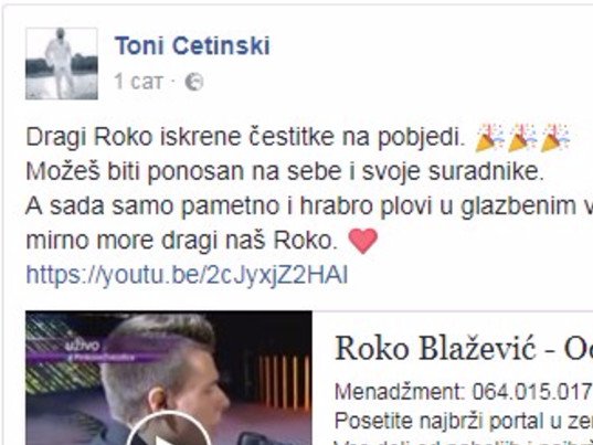 - To mi znači baš mnogo, još jedan podsticaj da zapnem još bolje. Čudno je kada ti tako neka poznata ličnost, koja nema pojma za tebe, tako nešto napiše, a još prvi put kad me je pohvalio, to nije bila njegova pesma, nego Tošeta Proeskog - prisetio se Roko brojnih pohvala koje mu je uputio Cetinski.