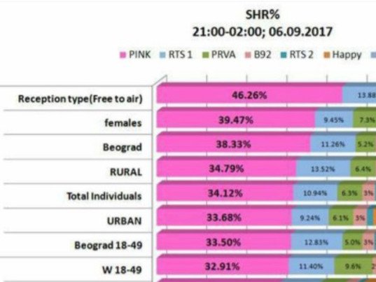 Tokom čitavog jučerašnjeg dana, TV Pink bila je najgledanija stanica u Srbiji, uključujući ne samo komercijalne emitere, već i Javni servis, govore zvanična istraživanja agencije Nielsen. Pored najgledanijih emisija TV Pink tokom celog dana, najveći broj gledalaca ikada u Srbiji pratio je početak najspektakularnijeg rijaliti šou programa ''Zadruga'', u terminu od 21 čas pa do dva sata iza ponoći. Auditorijum od neverovatnih 34,5 odsto gledalaca, pratio je šestosatni prenos ulaska učesnika u impresivan grad, dok je share u određenim delovima emisije dostizao gledanost od više od 46 odsto.Hvala na poverenju i ostanite uz rijaliti "Zadruga" i TV Pink!