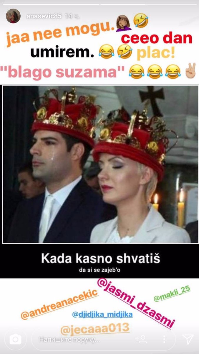 Ana je, naime, pre nekoliko dana objavila fotografiju sa crkvenog venčanja Milene Vučić, na kojoj se vidi kako njen suprug Nikola Burovac plače, što je Sevićku i njene prijatelje nasmejalo do suza.