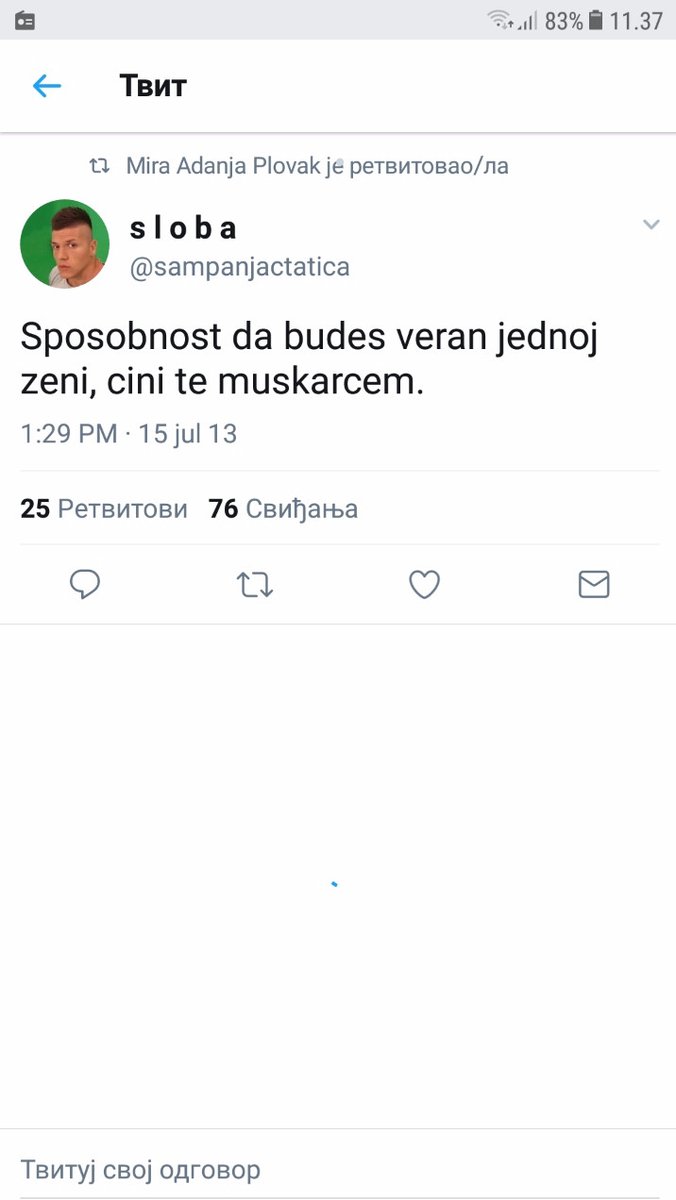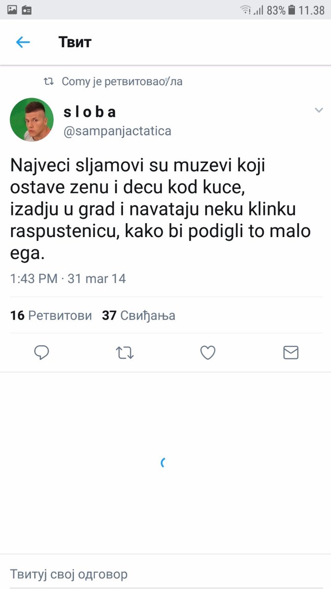 - Najveći šljamovi su muževi koji ostave ženu i decu kod kuće, izađu u grad i na'vataju neku klinku raspuštenicu kako bi podigli to malo ega - glasi drugi tvit.