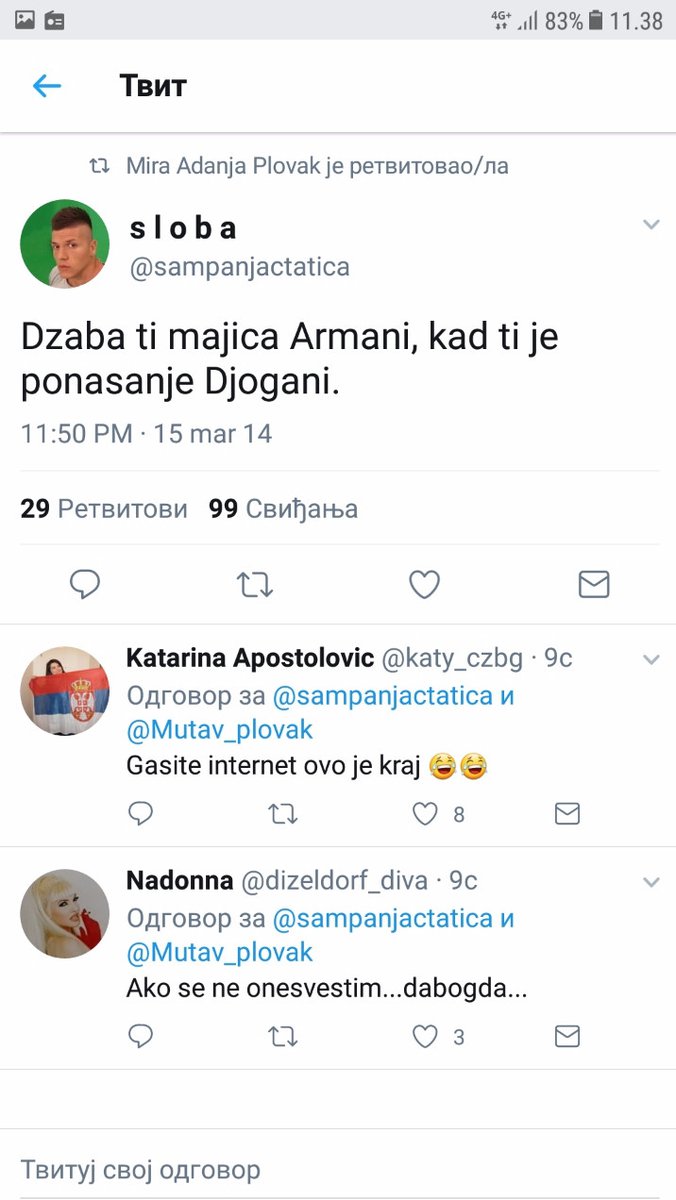 Ipak, trećim je pobedio napisavši "džaba ti majica Armani kad ti je ponašanje Đogani".