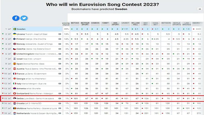 Što se tiče našeg predstavnika, Luka Bleka odnosno Luke Ivanovića iz Čačka, on je trenutno u padu i kladionoice mu ne daju prevelike šanse za pobedu. Naime, ona je na jednoj kladionici na dnu liste sa šansom od 101 da se Evrovizija opet održi u Srbiji.