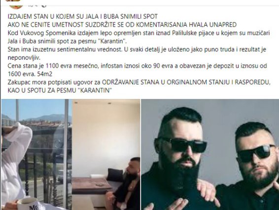 - Kod Vukovog spomenika izdajem lepo opremljen stan iznad Paliluske pijace, u kojem su muzičari Jala i Buba snimili spot za pesmu "Karantin". Stan ima izuzetnu sentimentalnu vrednost. U svaki detalj je uloženo jako puno truda i rezultat je neponovljiv. Cena stana je 1.100 evra mesečno, infostan iznosi oko 90 evra, a obavezan je depozit u iznosu od 1.600 evra. 54 metara kvadratnih. Zakupac mora potpisati ugovor za održavanje stana u originalnom stanju i rasporedu, kao u spotu za pesmu "Karantin" - stoji u opisu objave, dok su se ispod nizali razni komentari, i dok neko misli da je reč o lažnom oglasu, bilo je i onih koji su bili izrevoltirani ovim opisom.
