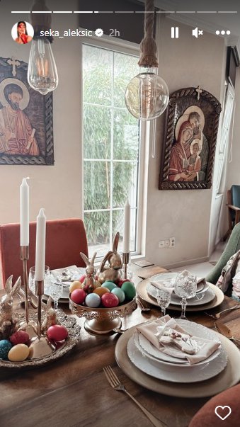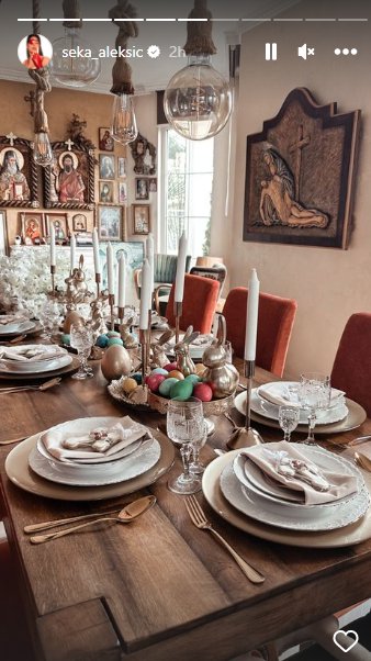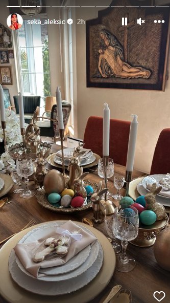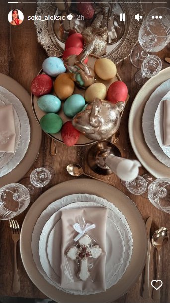 Seka je pokazala svojim pratiocima na Instagramu njenu Uskršnju trpezu, a ono što je privuklo takođe pažnju jeste dekoracija koja se našla na njenom stolu. Aleksićeva je snimila sto na kojem su svećnjaci, medenjaci u obliku krsta, šarena jaja, kao i zeke, a uz sve to i prelepo cveće.
