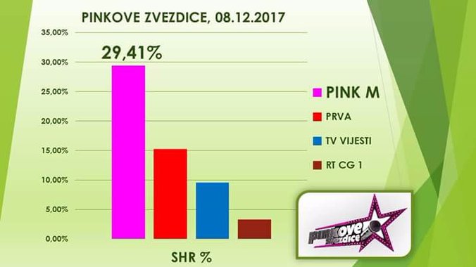 O tome svedoče i podaci iz Crne Gore, gde je prošlonedeljno izdanje "Pinkovih zvezdica" emitovano 8. decembra na televiziji Pink M bilo najgledanije - najpopularniji muzički šou u regionu ostvario je udeo u gledanosti (share) od čak 29,41%, i daleko iza sebe ostavio sve tamošnje emitere.