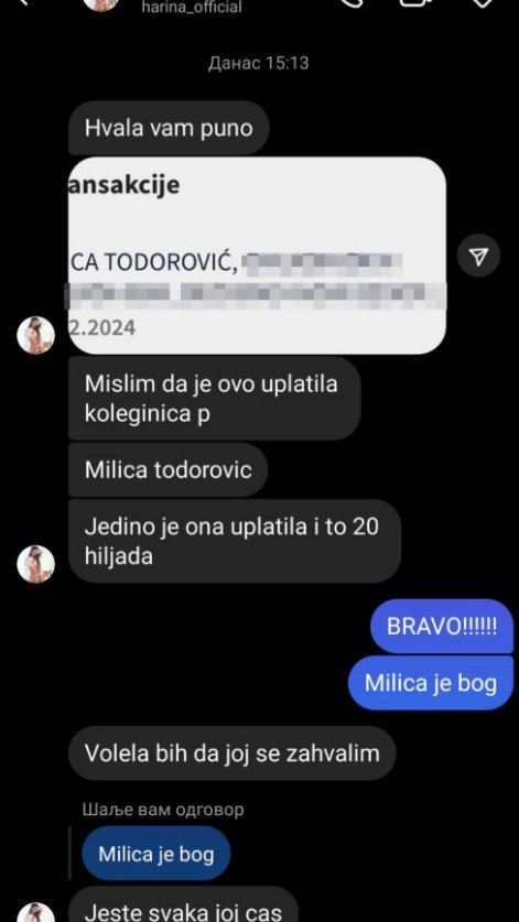 Mislim da je ovo uplatila koleginica Milica Todorović. Jedino je ona uplatila i to 20.000 dinara. Volela bih da joj se zahvalim - navedeno je u poruci koja je dostavljena našoj redakciji.