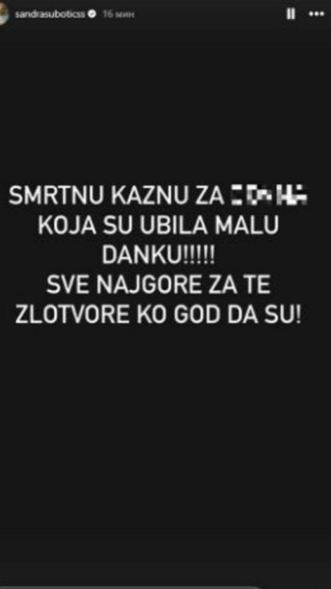 Smrtu kaznu za one koji su ubili malu Danku! Sve najgore za te zlotvore, ko god da su - napisala je Sandra Subotić.