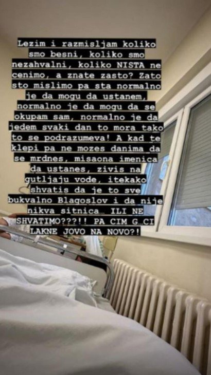 - Ležim i razmišljam koliko smo besni i nezahvalni, koliko ništa ne cenimo, a znate zašto? Zato što mislimo "Pa šta, normalno je da mogu da ustanem i da se okupam sam. Normalno je da jedem svaki dan, to mora tako i to se podrazumeva" - napisala je ona, a zatim otkrila u kakvom je stanju trenutno: