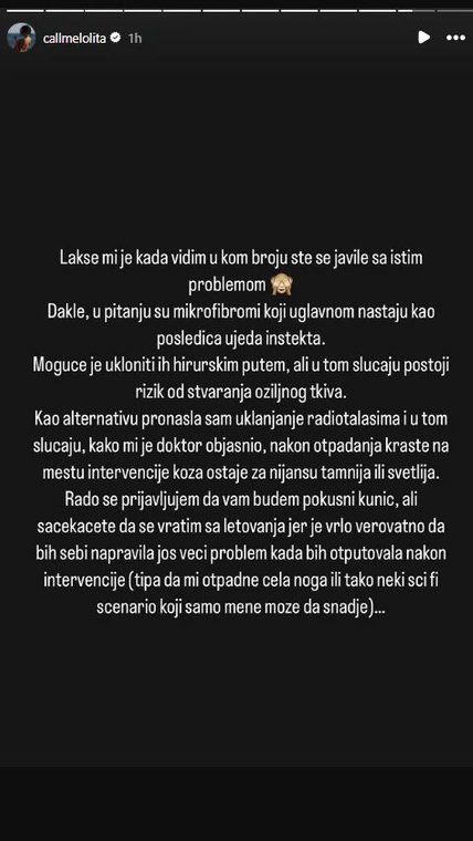 - Lakše mi je kada vidim u kom broju ste se javile sa istim problemom. Dakle, u pitanju su mikrofibromi koji uglavnom nastaju kao posledica ujeda insekta. Moguće je ukloniti ih hirurškim putem, ali u tom slučaju postoji rizik od stvaranja ožiljnog tkiva. Kao alternativu pronašla sam uklanjanje radiotalasima i tom slučaju, kako mi je doktor objasnio, nakon otpadanja kraste na mestu intervencije koža ostaje za nijansu tamnija ili svetlija. Rado se prijavljujem da vam budem pokusni kunić, ali sačekaćete da se vratim sa letovanja jer je vrlo verovatno da bih sebi napravila još veći problem kada bih otputovala nakon intervencije - napisala je ona.