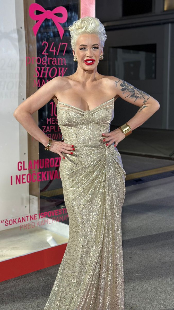 Dušica Jakovljević je za večerašnje gala veče u Šimanovcima kada će se na imanje useliti i odabrani odabrala efektnu zlatnu, dugu haljinu.