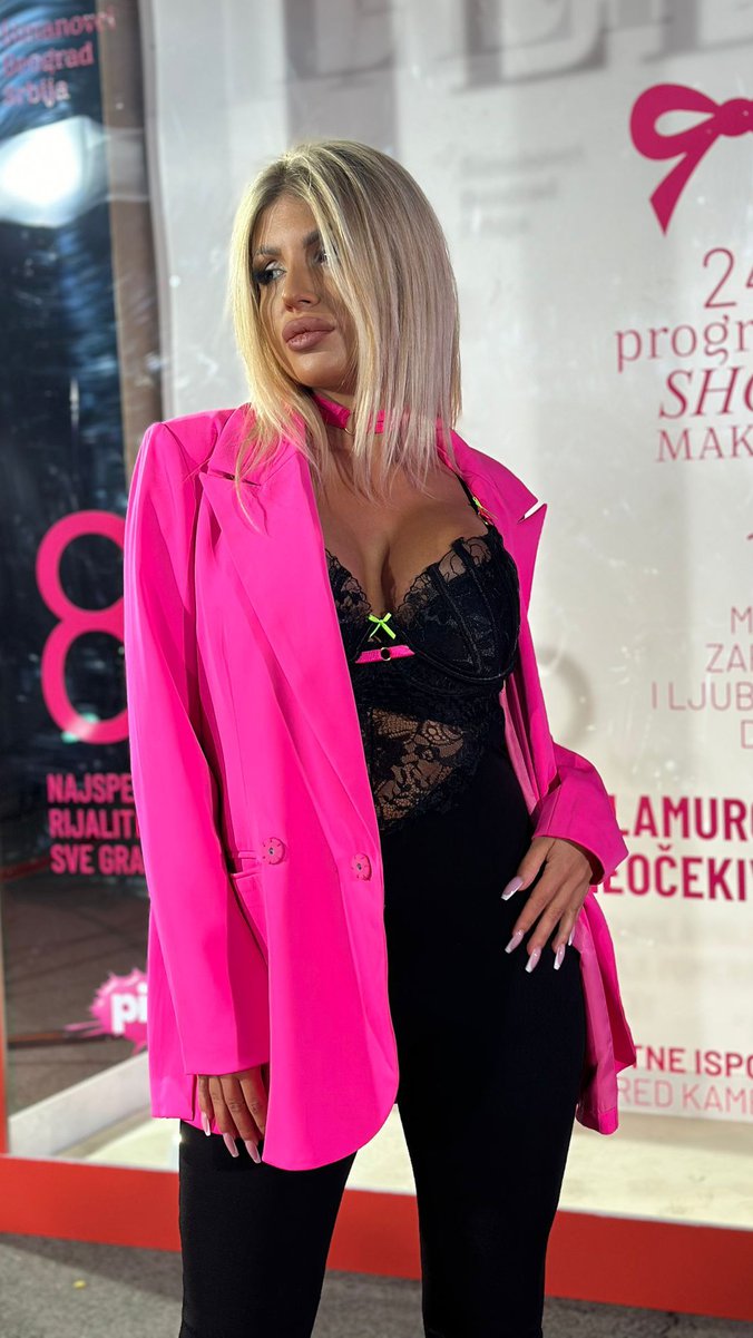 Ivana Šopić ima na sebi crne pantalone i korset, a preko pink efektan sako.