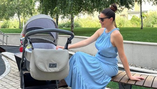 Na fotografiji koju je objavila, Sanja je sedela na klupi, odevena u elegantnu plavu haljinu, dok se pored nje, u kolicima za bebe, odmara mali Vuk.