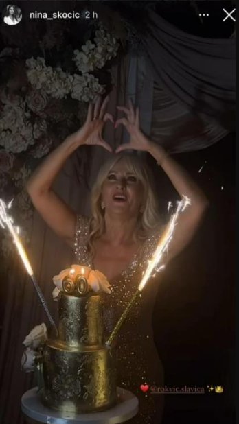 Takođe, torta je bila u zlatnoj boji i na čak dva sprata, ukrašena prskalicama i svećicama.Kad je oduvala svećice Slavica je slala srca prisutnima i govorila: