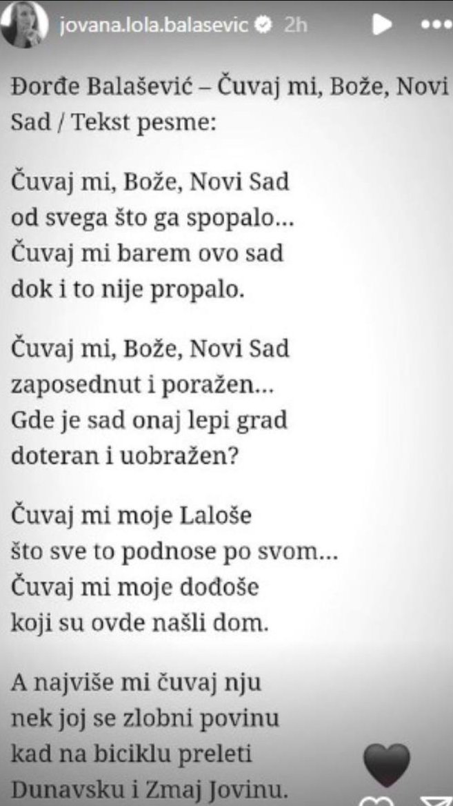 Jovana je na svom Instagram nalogu podelila dirljive stihove iz pesme svog oca "Čuvaj mi Bože Novi Sad".