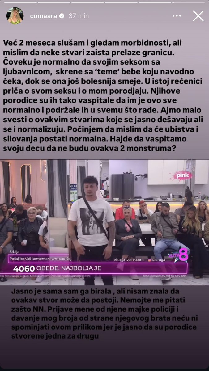 - Već dva meseca slušam i gledam morbidnosti,,ali mislim da neke stvari zaista prelaze granicu. Čoveku je normalno da svojim seksom sa ljubavnicom skrene sa teme bebe koju navodno čeka, dok se ona još bolesnija smeje. U istoj rečenici priča o svom seksu i o mom porođaju. Njihove porodice su ih tako vaspitale da im je ovo sve normalno i podržale ih u svemu što rade. Ajmo malo svesti o ovakvim stvarima koje se jasno dešavaju, ali se i normalizuju. Počinjem da mislim da će ubistva i silovanja postati normalna. Hajde da vaspitamo svoju decu da ne budu ovakva dva monstruma - napisala je Milica i dodala: