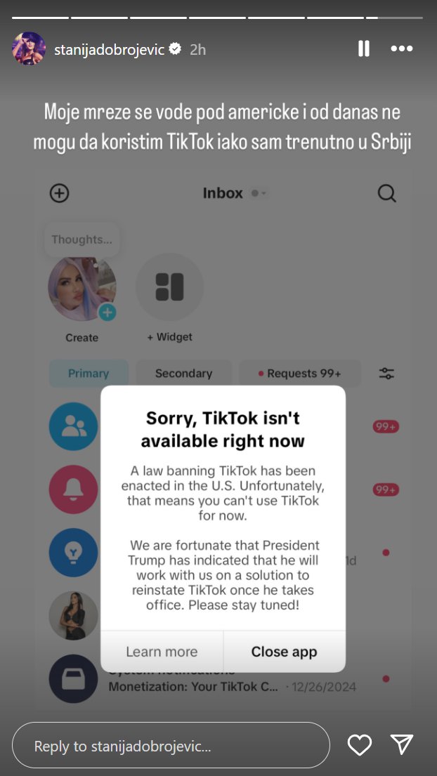 - Moje mreže se vode pod američke i od danas ne mogu da koristim tiktok, iako sam trenutno u Srbiji - napisala je Stanija uz skrinšot poruke od društvene mreže tiktok, na kojoj jasno piše da je tiktok ukinut, pa samim tim i njen nalog.