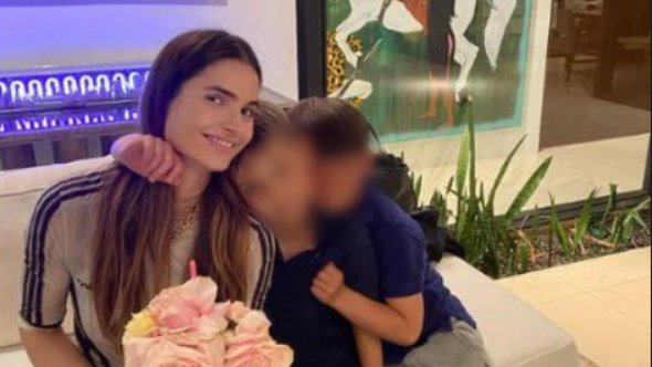 Ona je pozirala pored ogromne torte sa roze i žutim ružama, a sin ju je čvrsto grlio.