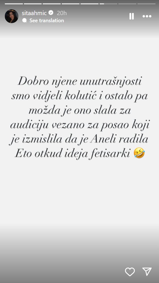 - Dobro, njene unutrašnjosti smo videli, kolutić i ostalo. Možda je sve ono što smo videli slala za audiciju vezano za posao koji je izmislila da je Aneli radila. Eto, odakle ideja fetišarki - napisala je Sita.