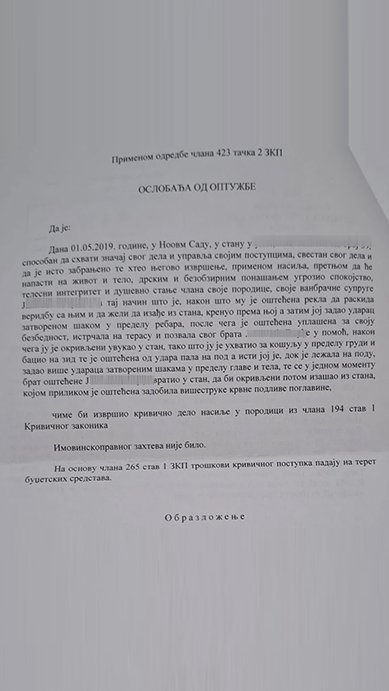 - Usvajanjem žalbe branioca okrivljenog, preinačava se presuda Osnovnog suda u Novom sadu tako što Viši sud u Novom Sadu okrivljenog Slobodana Vasića oslobađa optužbe da je dana 1.5.2019.godine primenom nasilja, pretnjom da će napasti na život i telo, drskim i bezobraznim ponašanjem ugrozio spokojstvo člana svoje porodice, svoje vanbračne supruge B.J.- piše između ostalog u presudi.