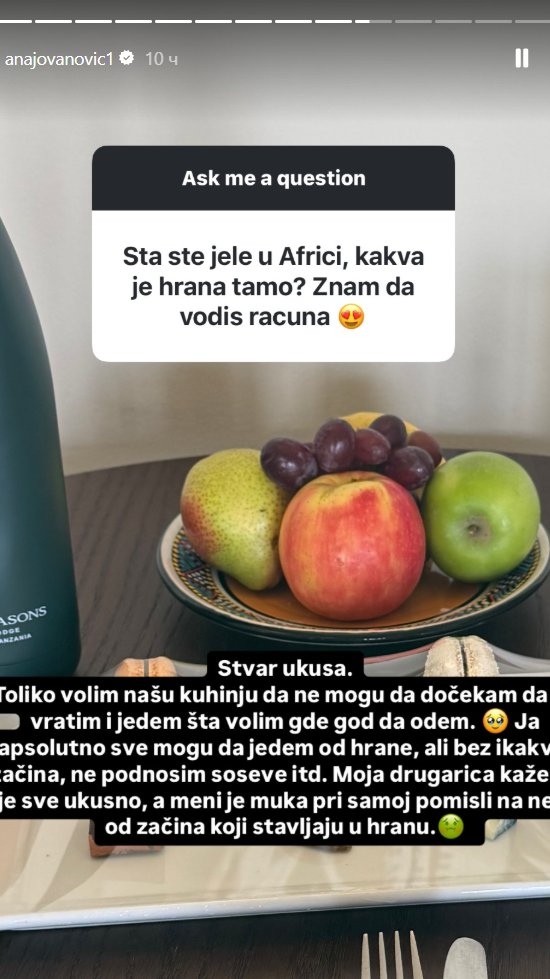 Ana Jovanović je na Instagramu podelila trenutke iz divljine koji su je ostavili bez teksta, a sada je odgovarala na pitanja pratioca. Jedno od njih bilo je vezano za ishranu u Africi.