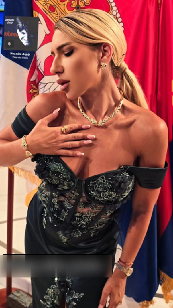 Jovana je bila u uskoj haljini čiji je gornji deo korset, a sva je prekrivena čipkom. Oko vrata je imala ogrlicu dve zmije koje se spajaju, a kosu je zalizala u rep.