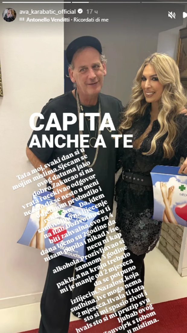"Tata moj, svaki dan si u mojim mislima. Sećam se ovog datuma jako dobro. Zakucao si na vrata i očekivao odgovor "ne". Kao da se nešto u meni odjednom probudila rekla sam: "Da, idem samovoljno na lečenje". Doživotno ću ti biti zahvalna, evo za četiri tačno dve godine da nisam popila i nikad više neću ni kap alkohola. Proživljavao si sa mnom tri godine pakla, a na kraju trebalo mi je manje od dva meseca da se potpuno izlečim. Nažalost, koja sudbina, Ive moga nema dva meseca... Hvala ti, tata što si mi spasio život i pružio svu ljubav ovog sveta. Zauvek s tobom u mislima", napisala je Ava na storiju.