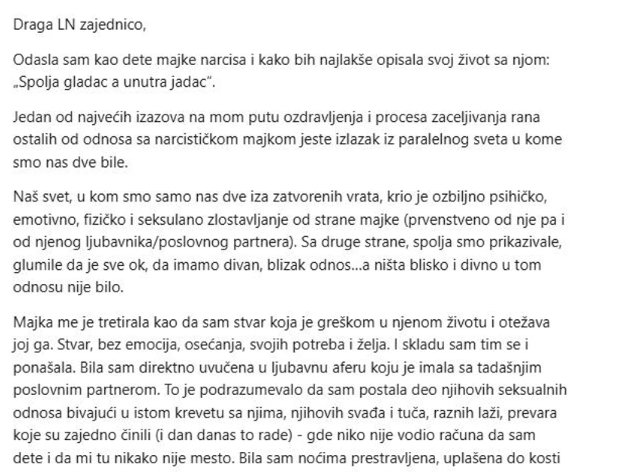 "Draga zajednico, odasla sam kao dete majke narcisa i kako bih najlakše opisala svoj život sa njom: "Spolja gladac a unutra jadac". Jedan od najvećih izazova na mom putu ozdravljenja i procesa zaceljivanja rana ostalih od odnosa sa narcističkom majkom jeste izlazak iz paralelnog sveta u kome smo nas dve bile. Naš svet, u kom smo samo nas dve iza zatvorenih vrata, krio je ozbiljno psihičko, emotivno, fizičko i seksulano zlostavljanje od strane majke (prvenstveno od nje, pa i od njenog ljubavnika/poslovnog partnera). Sa druge strane, spolja smo prikazivale, glumile da je sve ok, da imamo divan, blizak odnos, ništa blisko i divno u tom odnosu nije bilo.