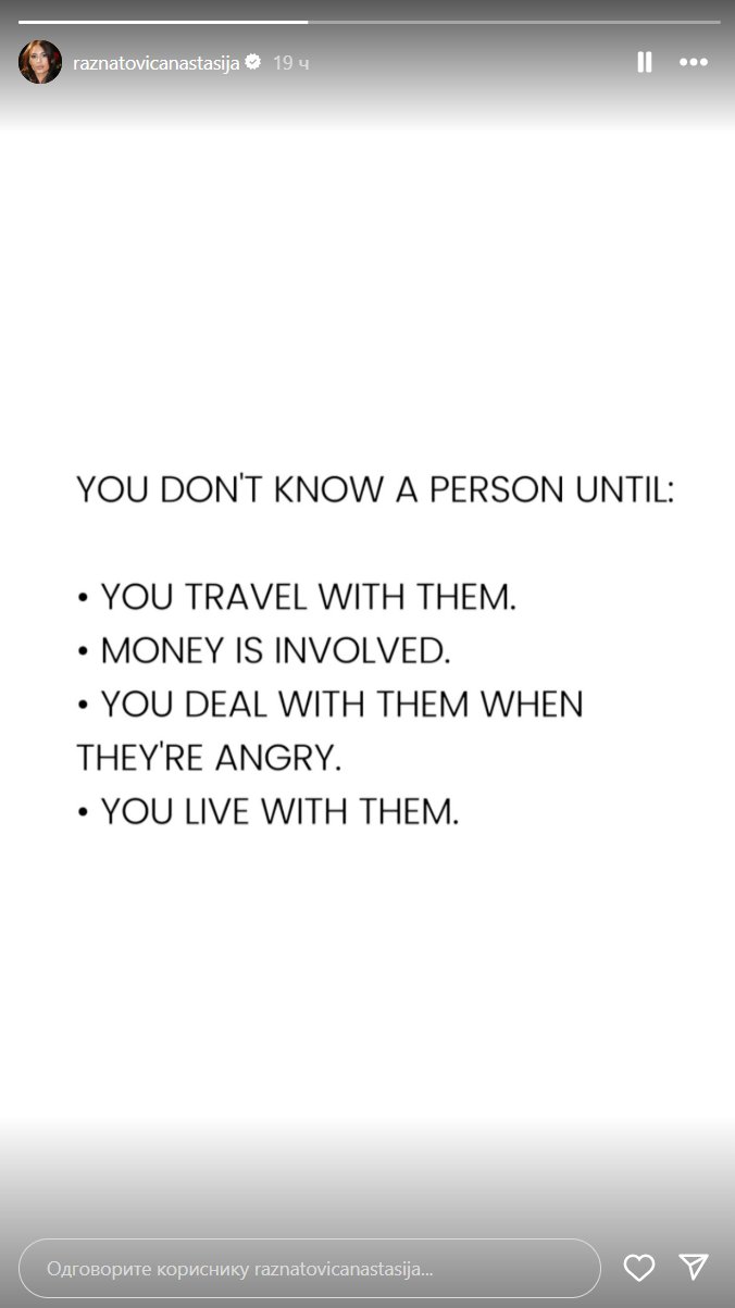 Bez obzira na pravi povod, poruka nosi snažnu notu iskrenosti i surovu realnost odnosa, što je razlog zbog kog je mnogi doživljavaju lično. Objave Anastasije Gudelj često izazovu reakcije i tumačenja, a ova poslednja dodatno podgreva radoznalost fanova.