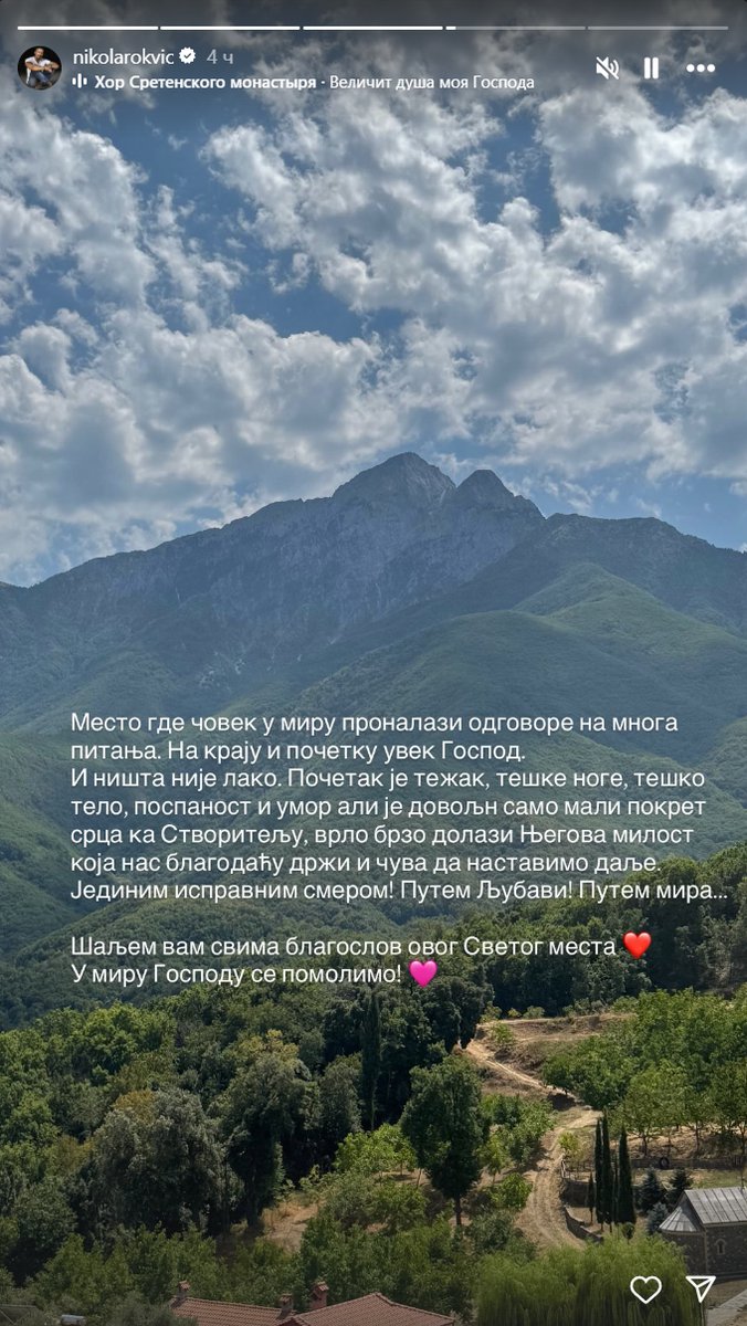 - Mesto gde čovek u miru pronalazi odgovore na mnoga pitanja. Na kraju i početku uvek Gospod. I ništa nije lako. Početak je težak, teške noge, teško telo, pospanost i umor, ali je dovoljan samo mali pokret srca ka Stvoritelju, vrlo brzo dolazi Njegova milost koja nas blagodaću drži i čuva da nastavimo dalje. Jedinim ispravnim smerom. Putem ljubavi, putem mira - napisao je Nikola na Instagramu, pa dodao: