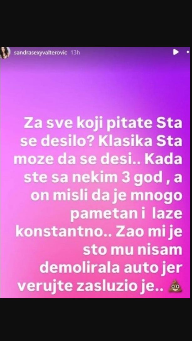"Za sve koji pitate šta se desilo? klasika, šta može da se desi... Kada ste sa nekim 3 godine, a on misli da je mnogo pametan i laže konstantno, žao mi je što mu nisam demolirala auto jer, verujte, zaslužio je" - napisla je pevačica na svom Instagam nalogu.