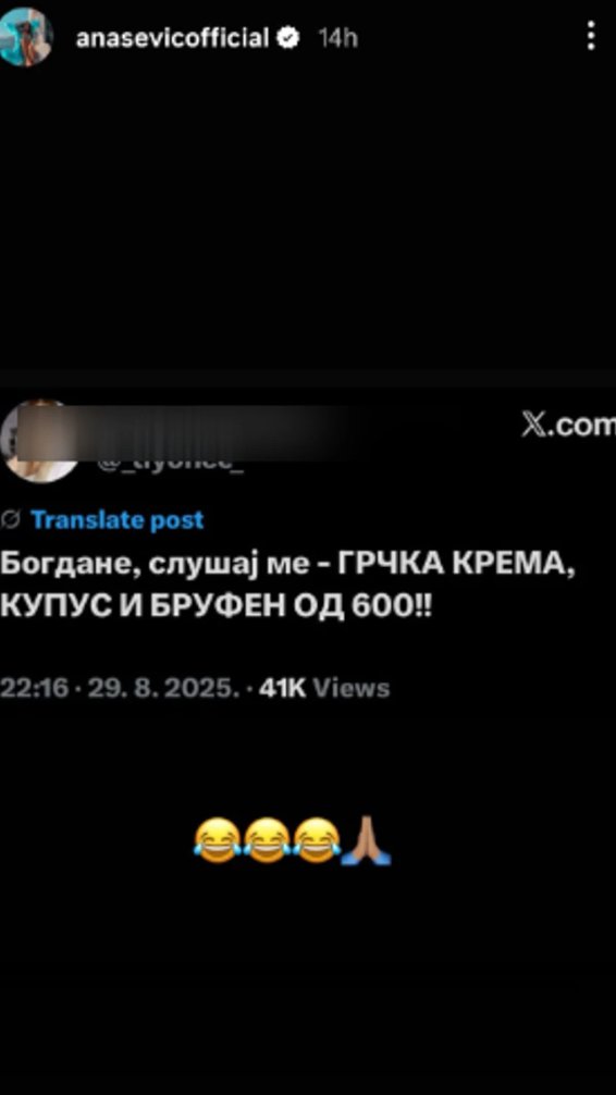 - Bogdane, slušaj me - Grčka krema, kupus i Brufen od 600 - napisala je jedna korisnica Tvitera, što je Ana odmah podelila.