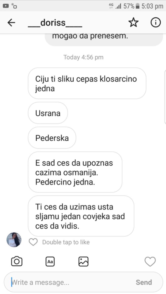 - Čiju ti sliku cepaš, klošarčino jedna! Usrana! Pederska! E sad ćeš da upoznaš Ćazima Osmanija! Pederčino jedna. Ti ćeš da ga uzimaš u usta, šljamu jedan od čoveka. Sad ćeš da vidiš! - napisala mu je ona.