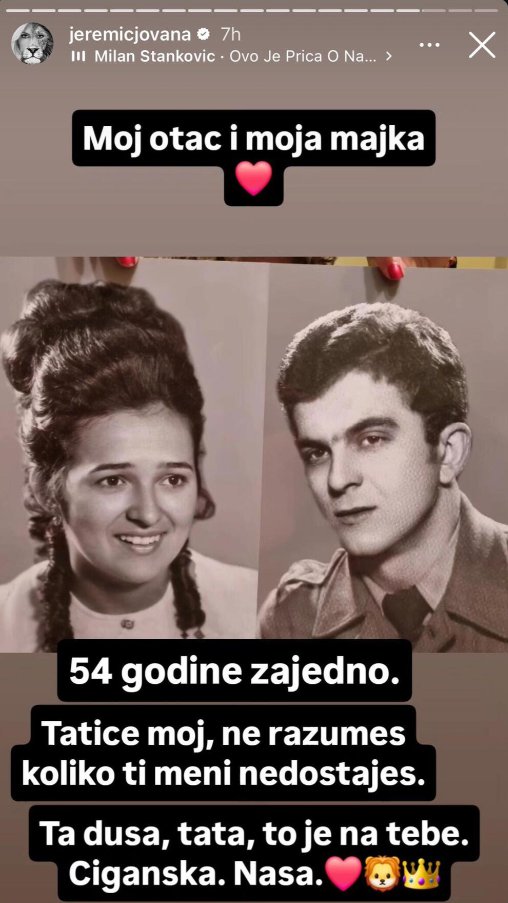 „Moj otac i moja majka“, napisala je Jovana, uz dodatak: „54 godine zajedno. TATICE MOJ, ne razumeš koliko ti meni nedostaješ. Ta duša, tata, to je na tebe. Ciganska. Naša.“