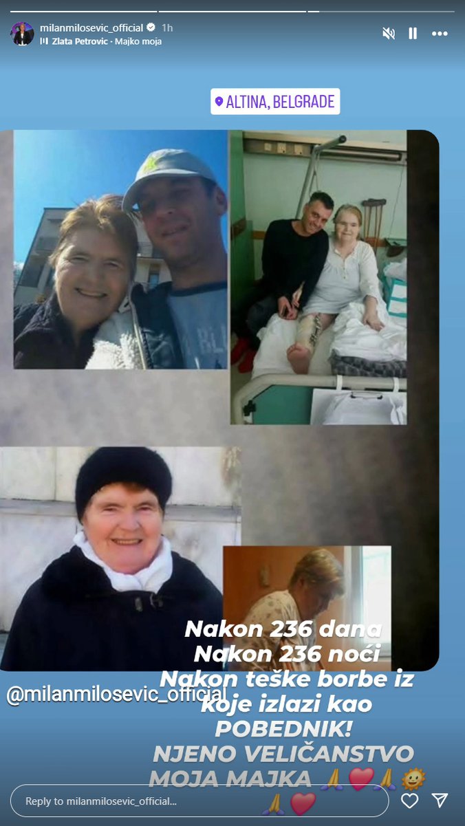 - Posle 236 dana i 236 noći. Posle teške borbe iz koje izlazi kao pobednica. Moja majka, moje veličanstvo – napisao je Milan ponosno, ističući da njegovoj sreći nema kraja.