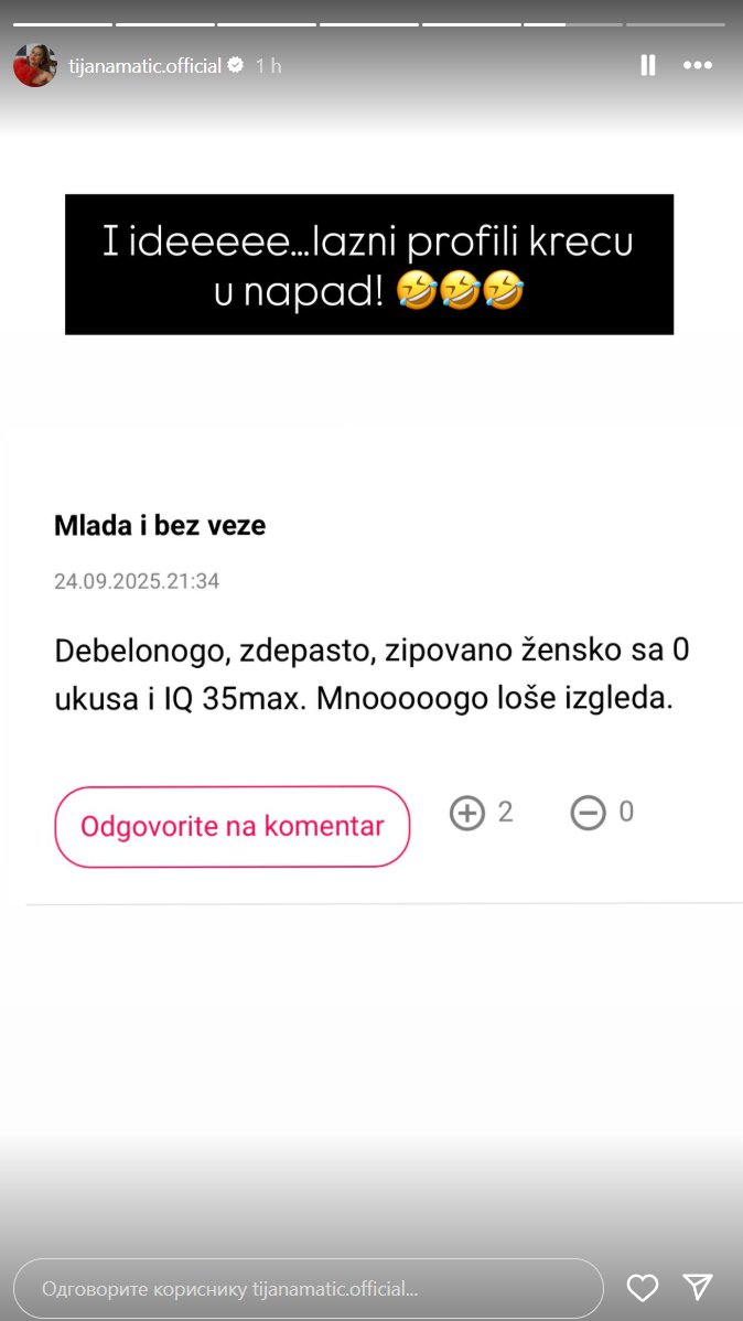 "Debelonogo, zdepasto, zipovano žensko sa 0 ukusa i IQ 35 max. Mnooooogo loše izgleda.“„Debelonogo, zdepasto, zipovano žensko sa 0 ukusa i IQ 35 max. Mnooooogo loše izgleda“, objavila je jedan komentar i dodala da su lažni profili profili krenuli u napad.