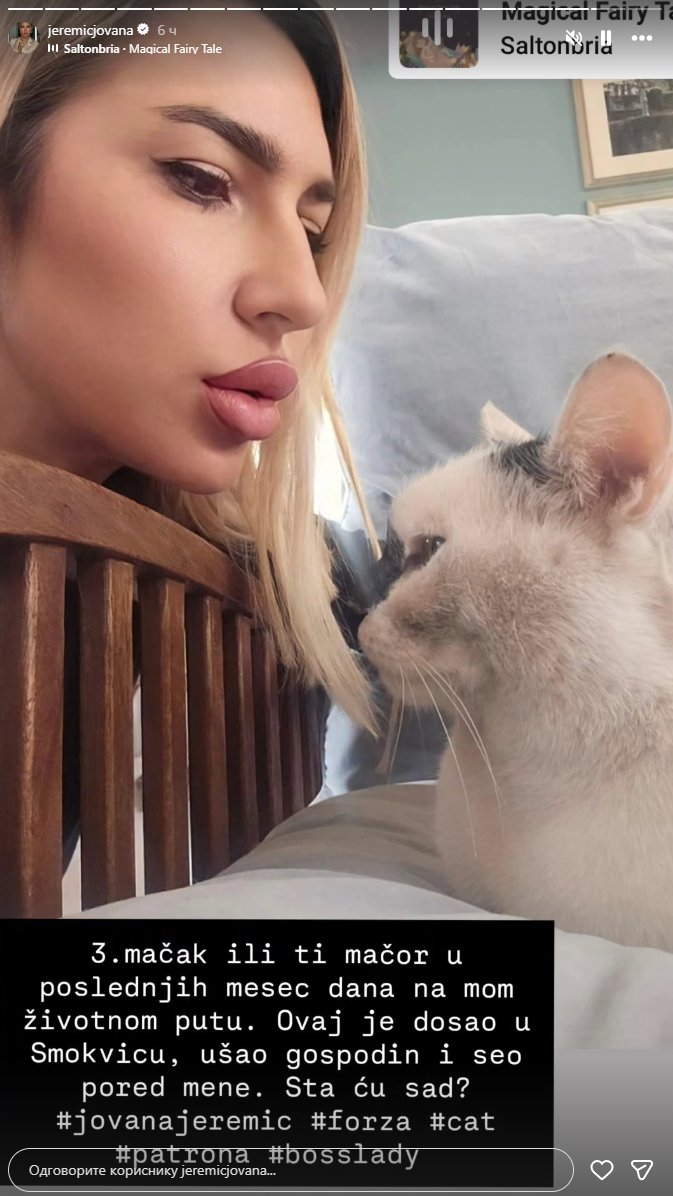 - Treći mačak, odnosno mačor u poslednjih mesec dana na mom životnom putu. Ovaj je ušao u kafić kao gospodin i seo pored mene. Šta ću sad? - pitala je Jovana svoje pratioce na Instagramu uz fotografiju sa mačkom.