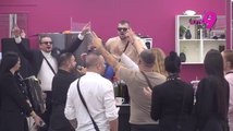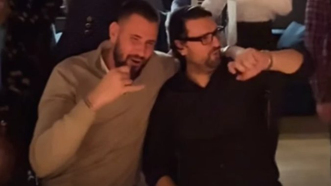 Njih dvojica su sve vreme pevali i slavili, dok su gosti iza njih igrali.Nina Šarić u elegantnoj haljiniDuško Šarić se slikao i sa suprugom Ninom Šarić koja je blistala u teget haljini sa belim tufnama.