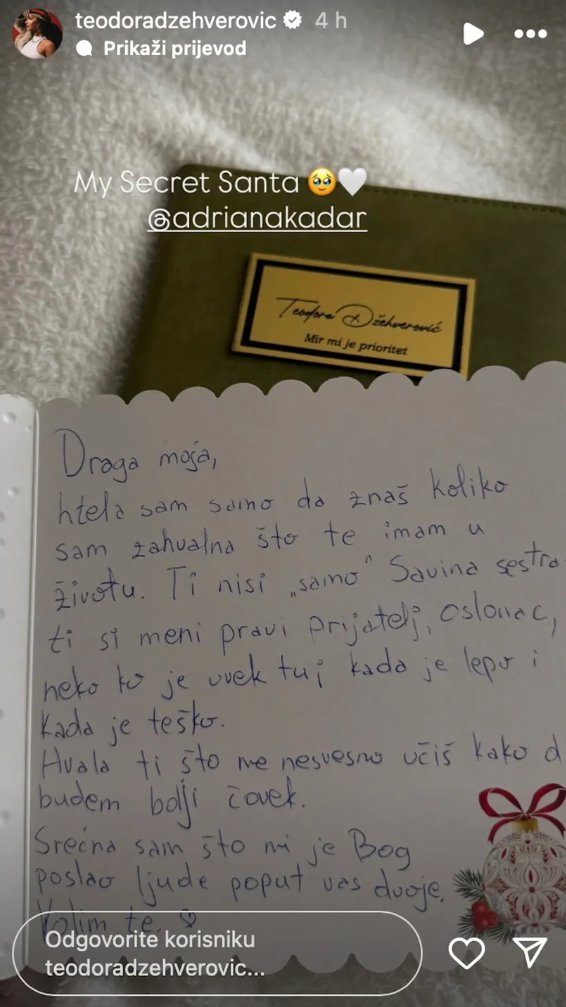 Porodično su igrali popularnu novogodišnju igricu "secret santa", a Adriana je izvukla snajku Teodoru, kojoj je poklonila dnevnik na kom piše "Mir je prioritet", a posebnu pažnju privukla je čestitka.