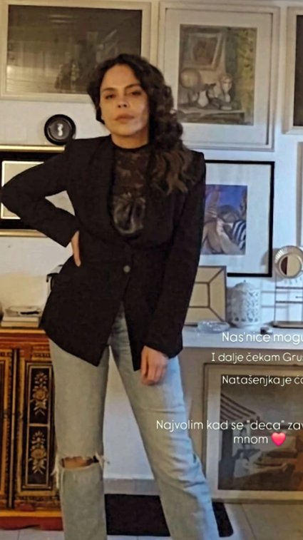 Na fotografiji, Srna pozira u opuštenom, ali veoma efektno stilizovanom izdanju – nosi svetle farmerke koje prate liniju tela, dok je gore uklopila čipkastu bluzu koja diskretno naglašava ženstvenost. Preko svega je ponela crni sako koji celom stajlingu daje dozu elegancije i ozbiljnosti.