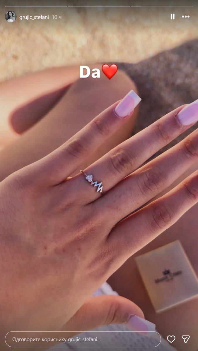 Stefani Grujić, bivša učesnica "Elite 8", danas je na svom Instagram profilu objavila fotografiju vereničkog prstena na ruci, pa je tako u opis ove slike napisala: "Da". Zbog ove njene fotografije, mreže su se potpuno usijale, budući da ona ima dete sa Munjezom.