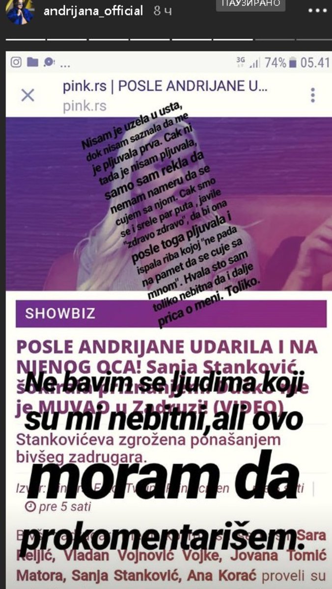 Ne bavim se ljudima koji su mi nebitni, ali ovo moram da prokomentarišem - napisala je Andrijana i dodala: