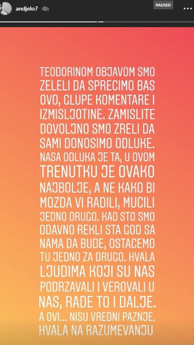 I dok je Teodora odmah obrazložila zbog čega su raskinuli, te je navela da nisu izdržali pritisak javnosti, Anđelo nije želeo da se oglašava.