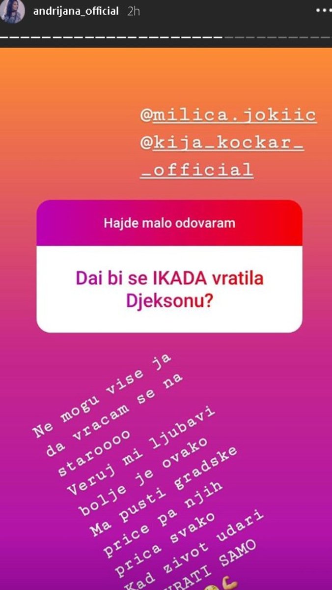 Andrijana je putem svog Instagram naloga jednom pratiocu odgovorila na to pitanje pesmom "Ne vraćam se na staro" koju izvodi njena bivša cimerka Kristina Kockar sa grupom Ministarke.