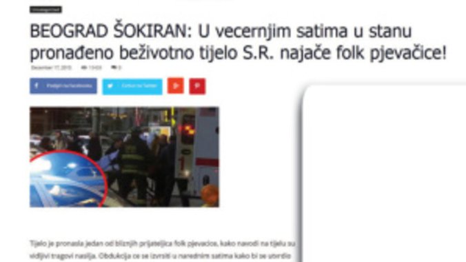 Na jednom bosanskom portalu objavljena je lažna vest da je folk diva Svetlana Ceca Ražnatović pronađena mrtva u svom domu, što je dovelo do pometnje. Portal se nije zaustavio samo na ovome, već su preneli kako su na telu pevačice vidljivi tragovi nasilja.