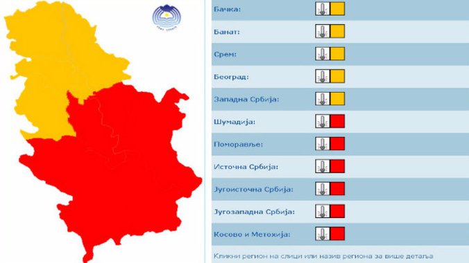 Crveni meteoalarm ostaje na snazi za Šumadiju, Pomoravlje, jug i istok Srbije, Kosovo i Metohiju, kao i za jugozapadni deo zemlje.